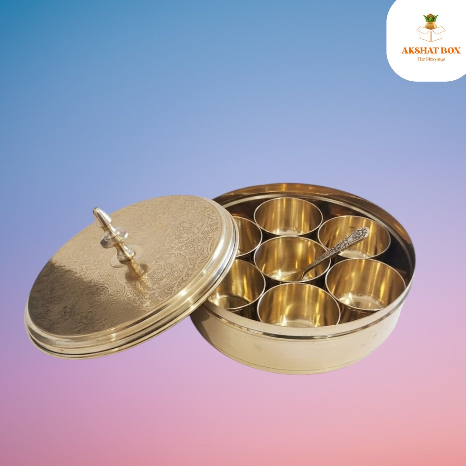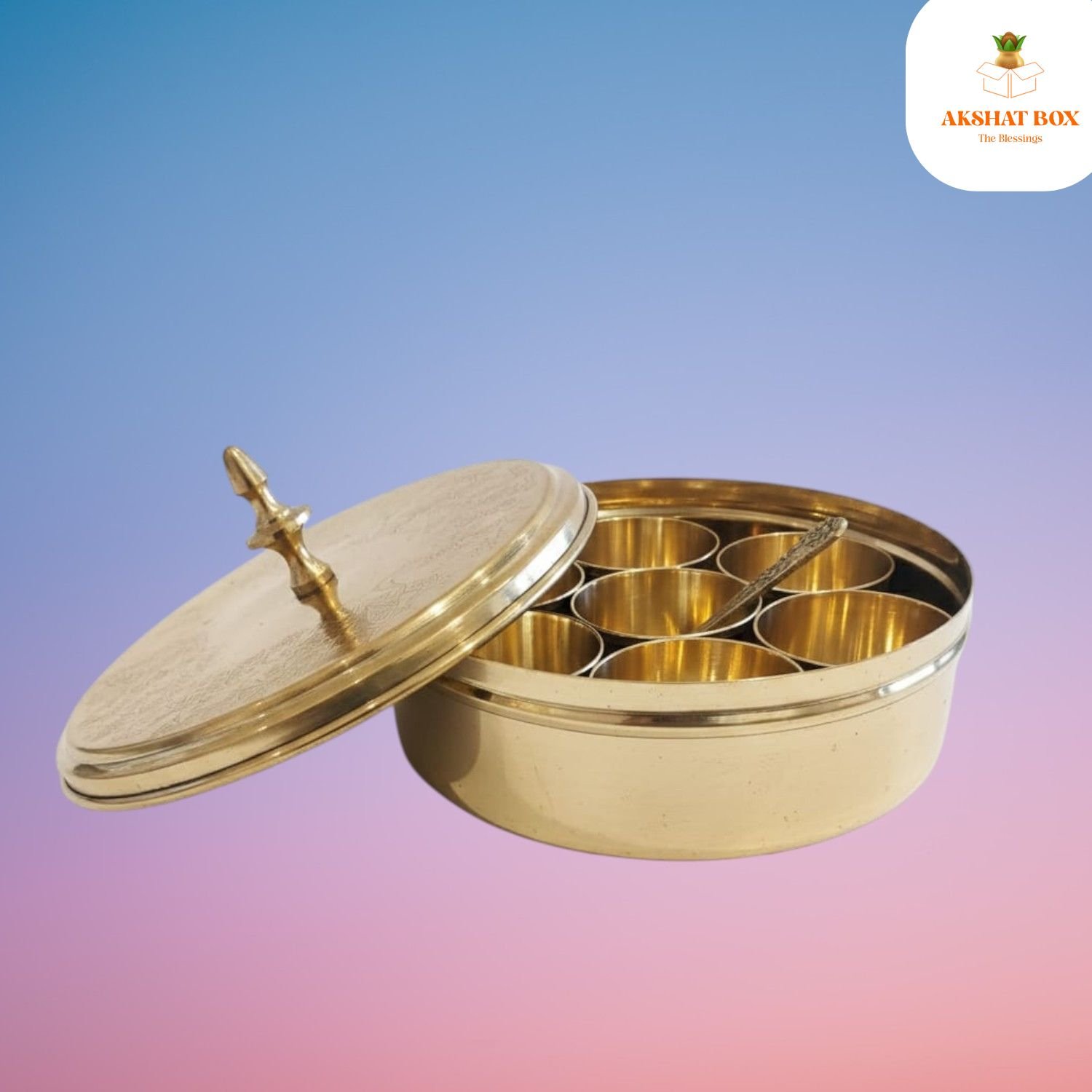 ✨ Upgrade your kitchen with the timeless beauty of the Akshatbox Brass Mini Masala Box – Order now! ✨