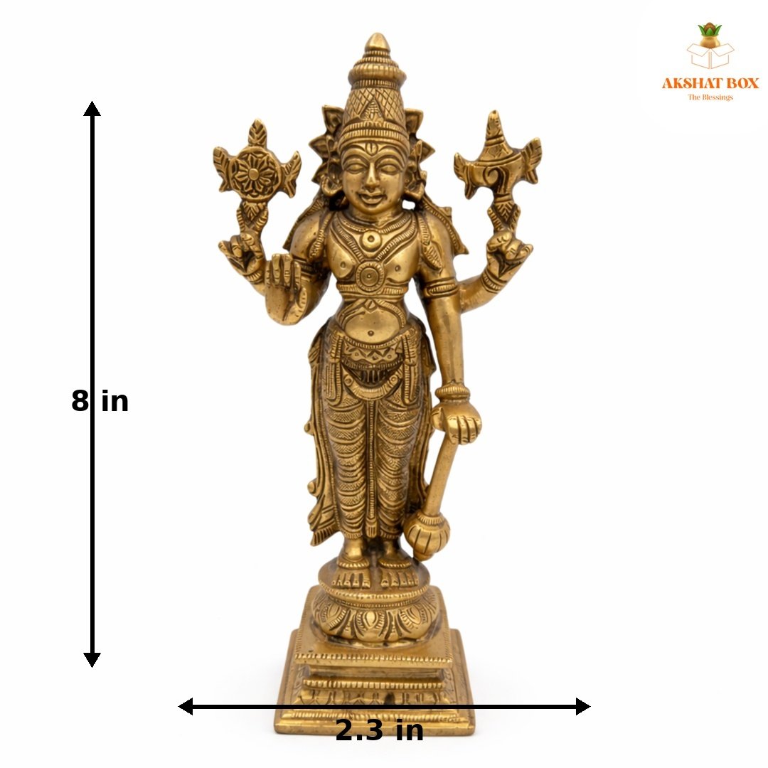 Bring home the divine presence of Lord Vishnu, the Preserver of the Universe, with this intricately crafted Brass Idol from AKSHATBOX. Designed with antique artistry and spiritual symbolism, this elegant sculpture stands tall at 8 inches and radiates balance, protection, and prosperity. Ideal for pooja rooms, home altars, and spiritual corners, this Vishnu idol invokes harmony and divine order into your living space.